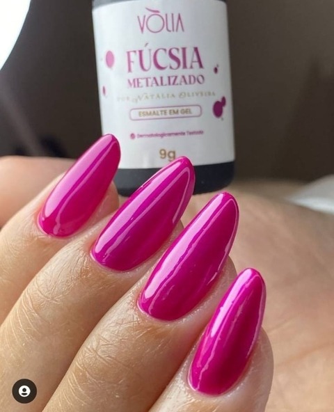 O Fúcsia Metalizado por Natalia Oliveira um esmalte em gel de tonalidade nica, a predominância do rosa e as sutis nuances de roxo resultam em uma cor vibrante e moderna.