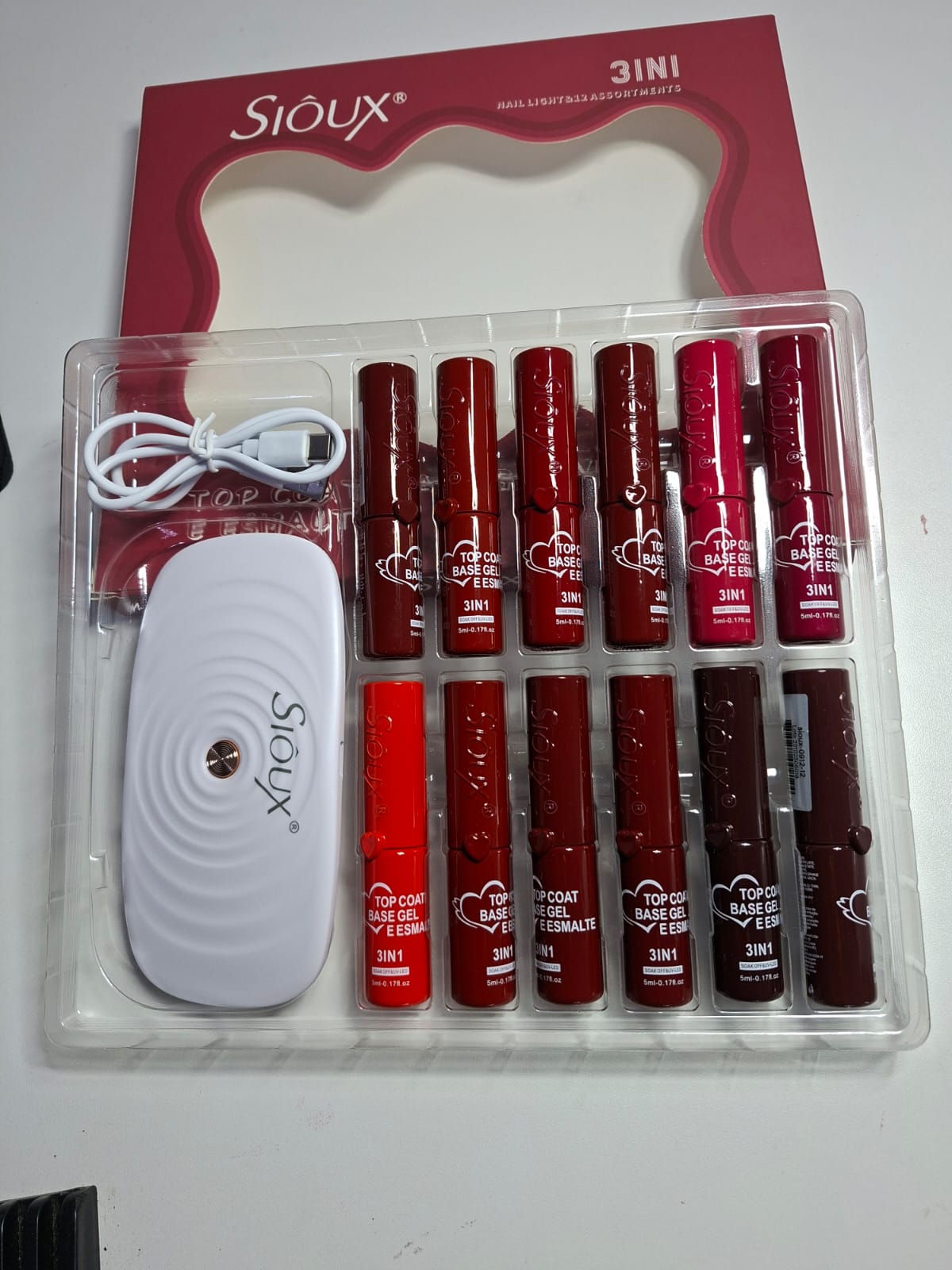 KIT TOP COAT E ESMALTE SIOUX 3 EM 1 COM MINI CABINE VERMELHO 12UND