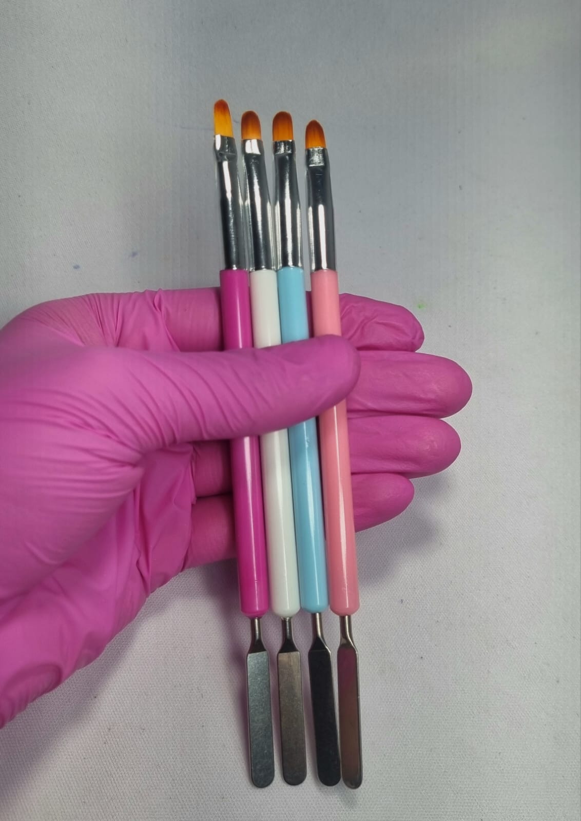 Possui 2 pontas, um lado pincel língua de gato com cerdas macias do outro lado uma espátula confeccionado em aço inox.